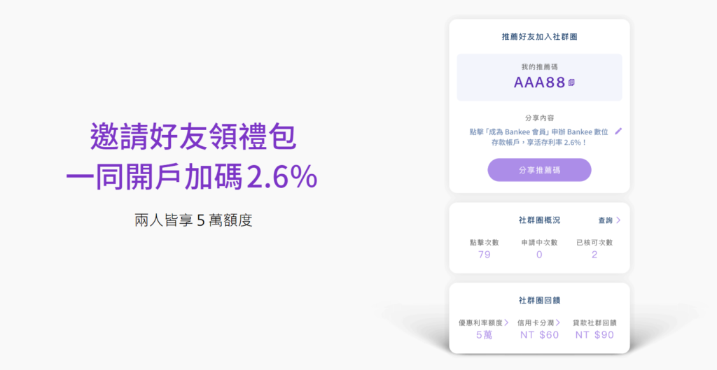 📌 Bankee帳戶 用推薦連結拿250元+6個月2.6%高利