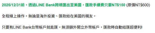 📌 Line Bank 最高1.5% 美股電匯150元 數位帳戶推薦碼